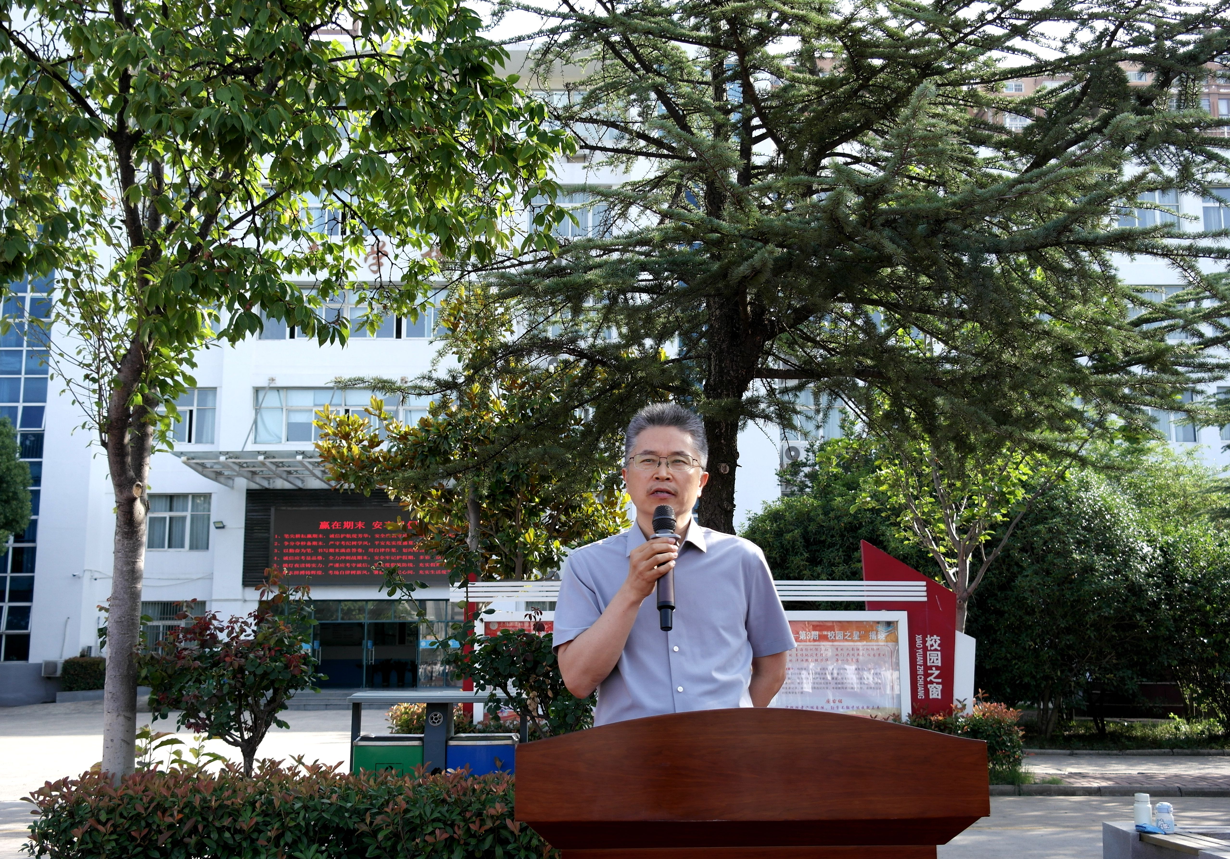 党委副书记、校长孙杰以鲜活事例为引,展开深入浅出的教导。从高考“扁担女孩”逆境拼搏的故事,诠释青春奋斗的真谛;借高考“迟到考生”被拒入场的教训,强调规则守护的意义;以假期“意外事件”惨痛教训为警示,敲响安全自警的警钟。他聚焦“衣食住行游,水火气电网”等生活场景,对食品安全、交通安全、消防安全、防溺水、防电诈等安全要点逐一强调,引导师生树牢“安全第一”的底线思维。