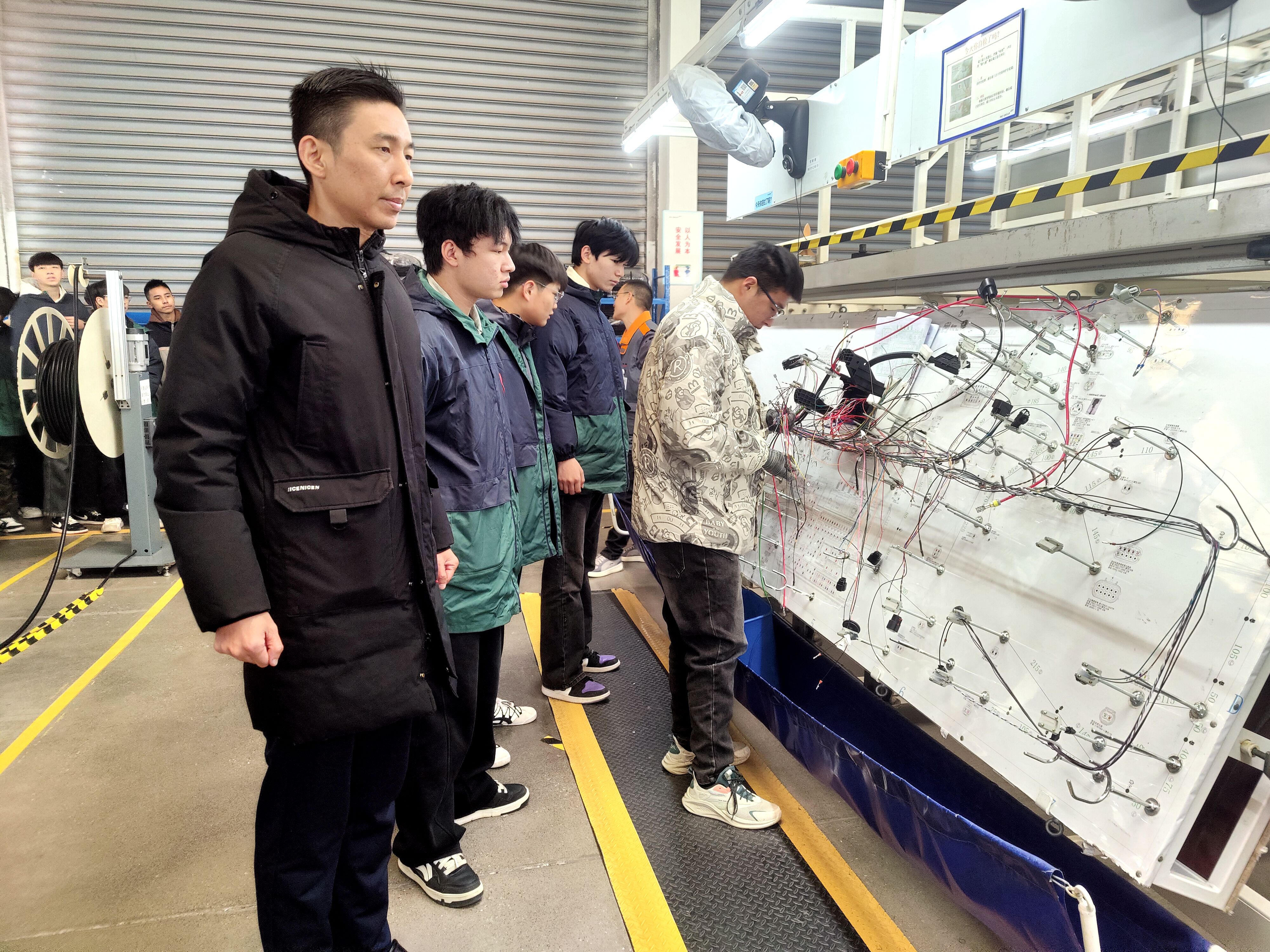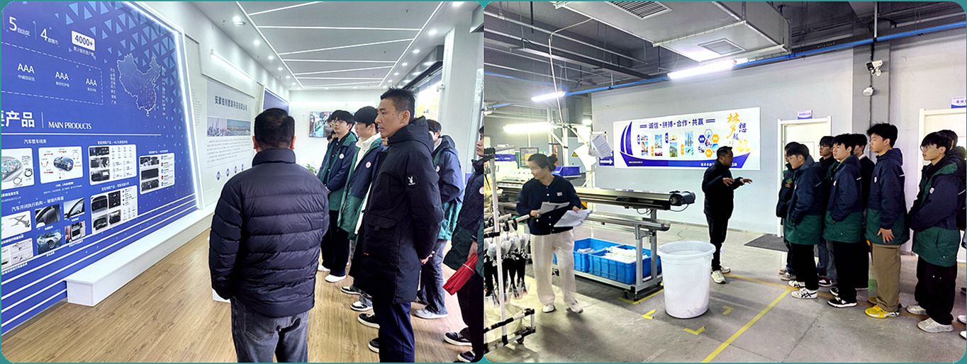 在企业技术骨干与工作人员的引导下,同学们怀着浓厚的兴趣走进生产车间、技术研发中心及产品展示区。从汽车核心零部件装配流程到新能源汽车检测维修技术,从智能化生产设备的操作演示到行业质量管控标准的详细解读,企业方通过“现场讲解+实物展示+互动答疑”的方式,为同学们呈现了一堂生动直观的实践课。同学们认真聆听、仔细观察,不时围绕技术原理、岗位需求、职业发展等问题与企业导师交流探讨,现场学习氛围热烈。​
