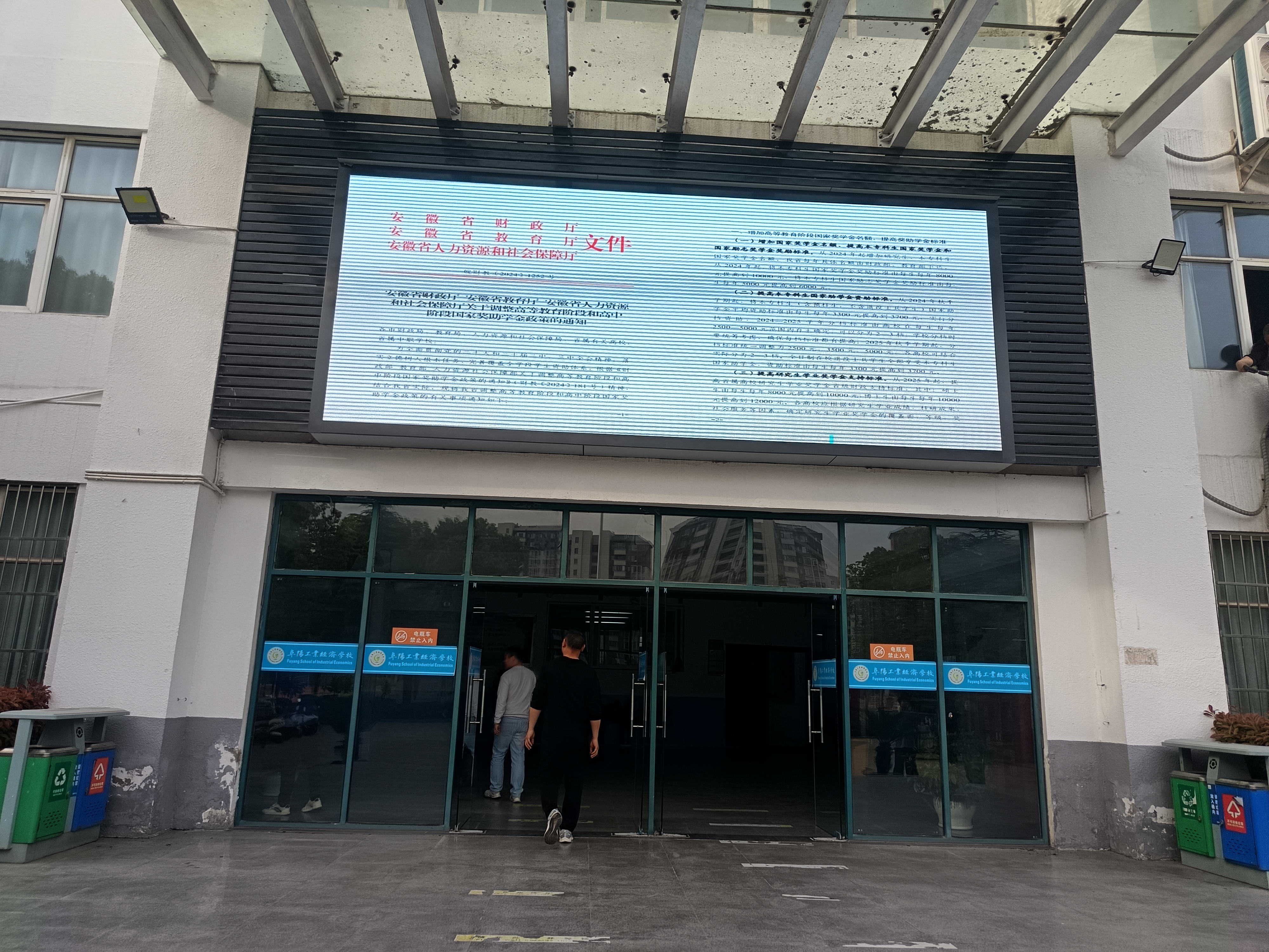 阜阳工业经济学校利用校园电子屏宣传《关于调整高等教育阶段和高中阶段国家奖助学金政策的通知》